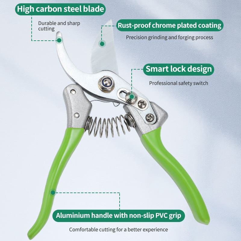 Superior Blade System: The cutting blade is forged from 50# high carbon steel, hardened to a formidable HRC50±2, and chrome-plated for a razor-sharp, rust-resistant edge that ensures clean cuts and plant health.